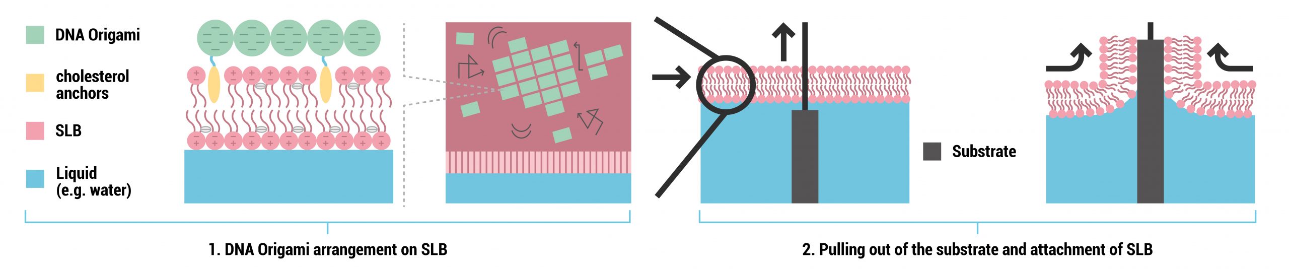 Figure 3: Schematic sketch of the large scale arrangement of DNA origami based sensor array on supporting lipid-bilayers (SLB) anchored by cholesterol units and the transfer mechanism to flexible substrate by LB.