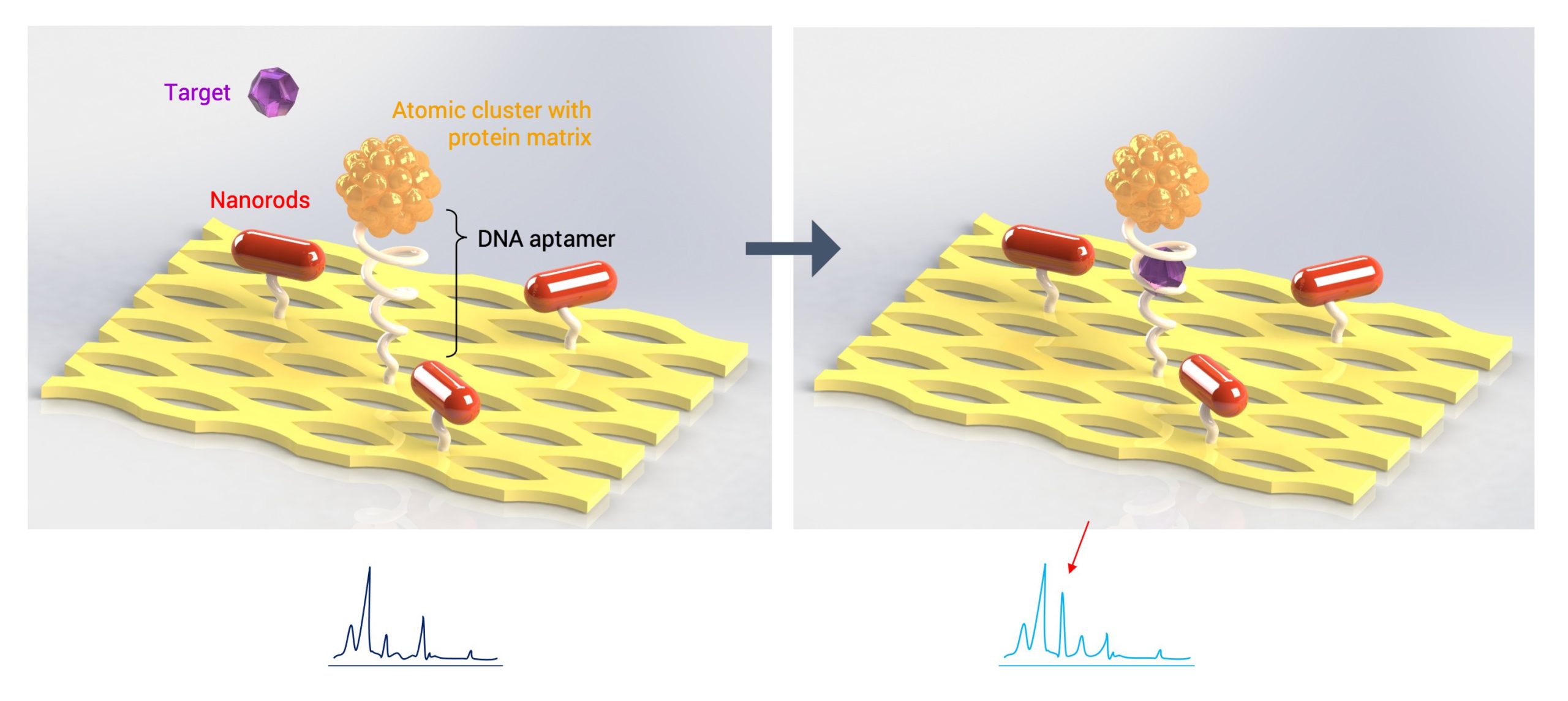 Metallic atomic clusters (ACs) are integrated into a biological marker molecule (DNA or antibody) and thus represent the biological sensor element (Fig. 1). This is specifically integrated into a nanoarray, made of additional metallic nanoparticles, precisely controlled by a DNA origami template and will lead to a significant increase in signal. The DNA origami serves as an individually, inter- and intramolecularly programmable ânano-breadboardâ. A DNA origami consists of a single strand of DNA, folded by a thermal treatment and certain staple strands into any shapes (2D as well as 3D, dimensions of approx. 100 nanometers). So-called âsticky endsâ on the surface of the DNA origami offer the possibility of an individual implementation of the sensing elements and nanoparticles, by means of correspondingly complementary oligonucleotides with a resolution of approx. 2 nm. When the analyte is connected to the sensor element, a change in the Raman signal can thus be detected without major delay using surface-enhanced Raman spectroscopy (SERS), as depicted in Fig.2.
